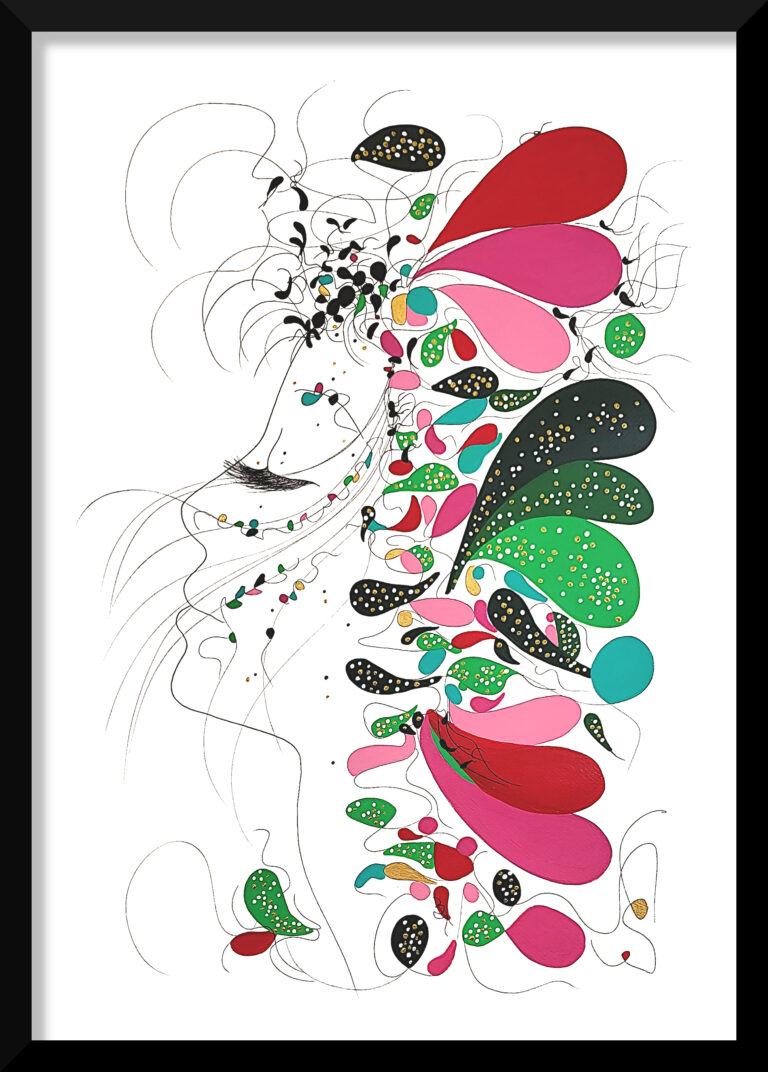 Engagée en faveur de la biodiversité, l'Artiste a créé cette série picturale où les couleurs vives, les roses nuancées avec les verts velours évoquent le parfum des fleurs, l'or et l'argent la lumière et les différents symboles la biodiversité.