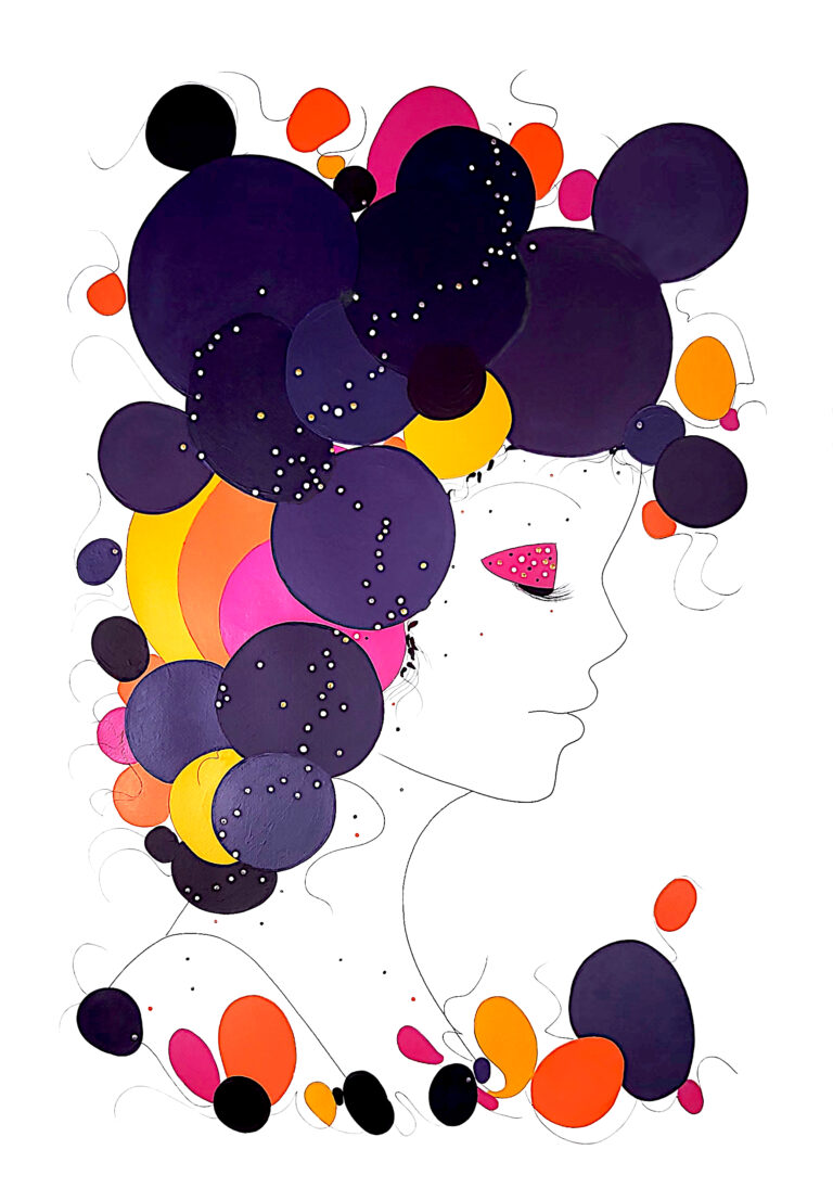 The Artist works in pictorial series which all explore a central theme: love, dreams, biodiversity, the universe… Her works are the result of careful study and in-depth reflection in order to appear simple . Its are characterized by a subtle fusion between realism and abstraction in an almost minimalist style. Realism is manifested by the refined representation of its subjects. Abstraction, for its part, is found in the expression of colorful symbols which are articulated in choreographies around characters carrying emotions and ideals.