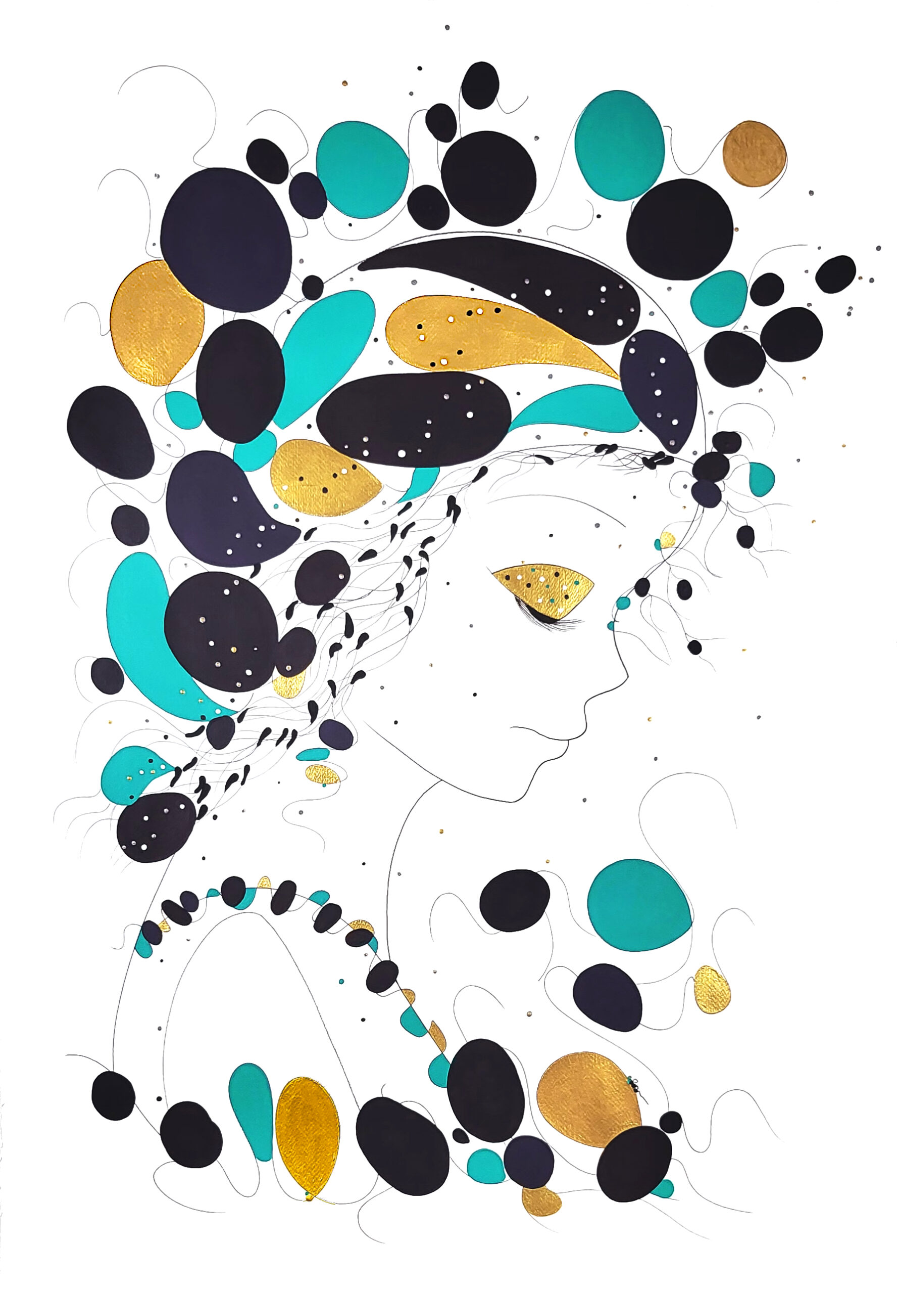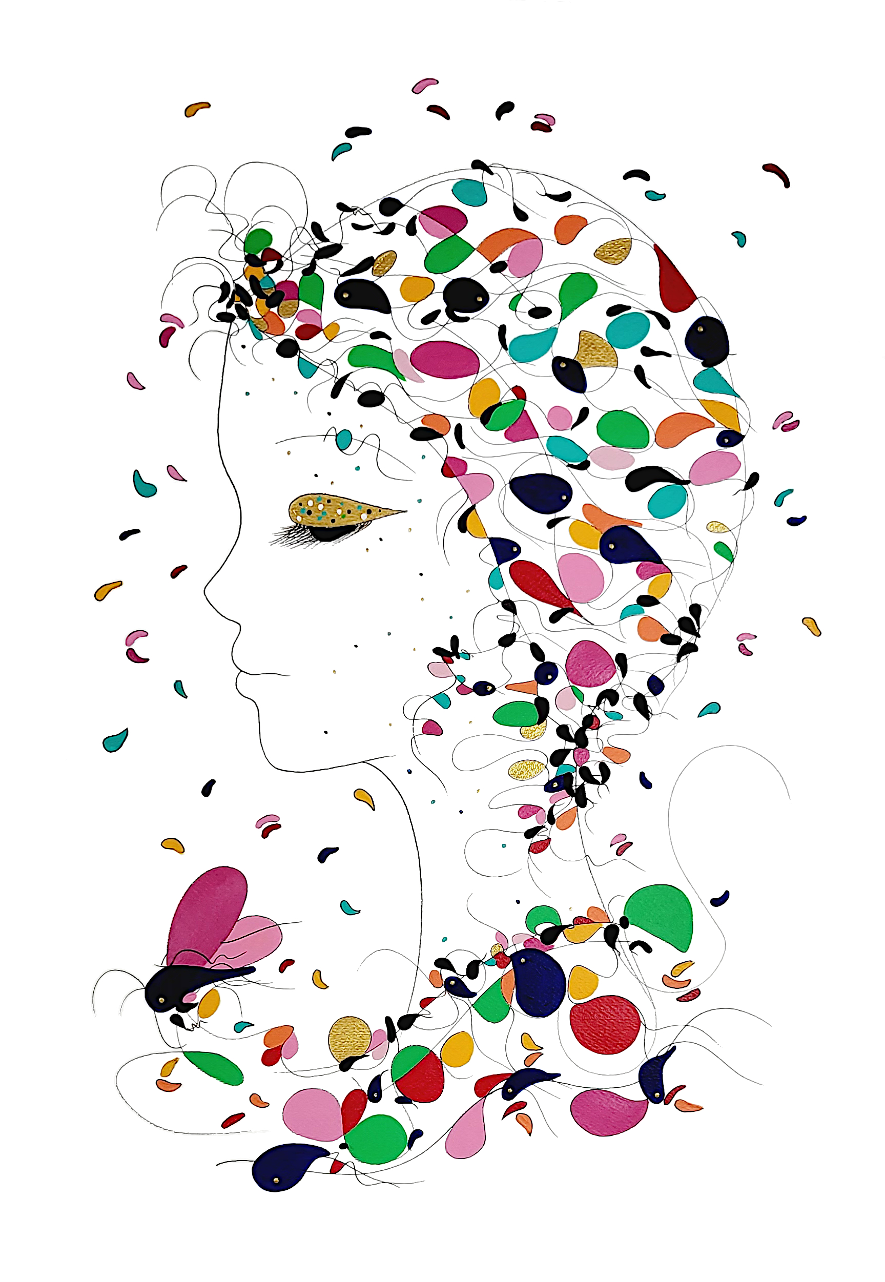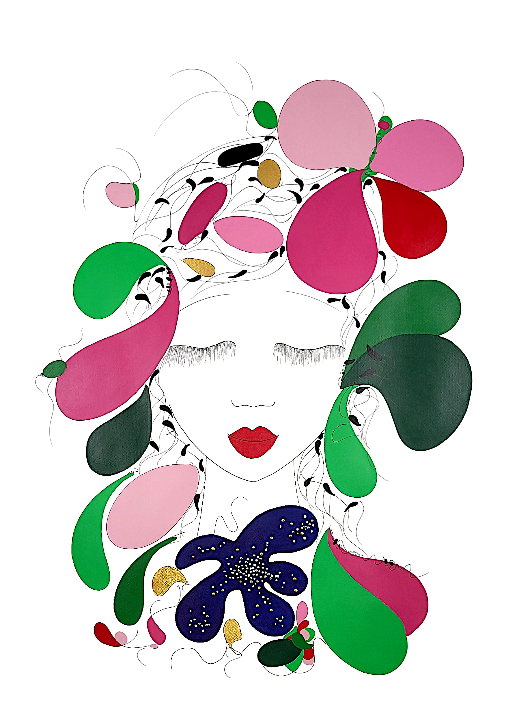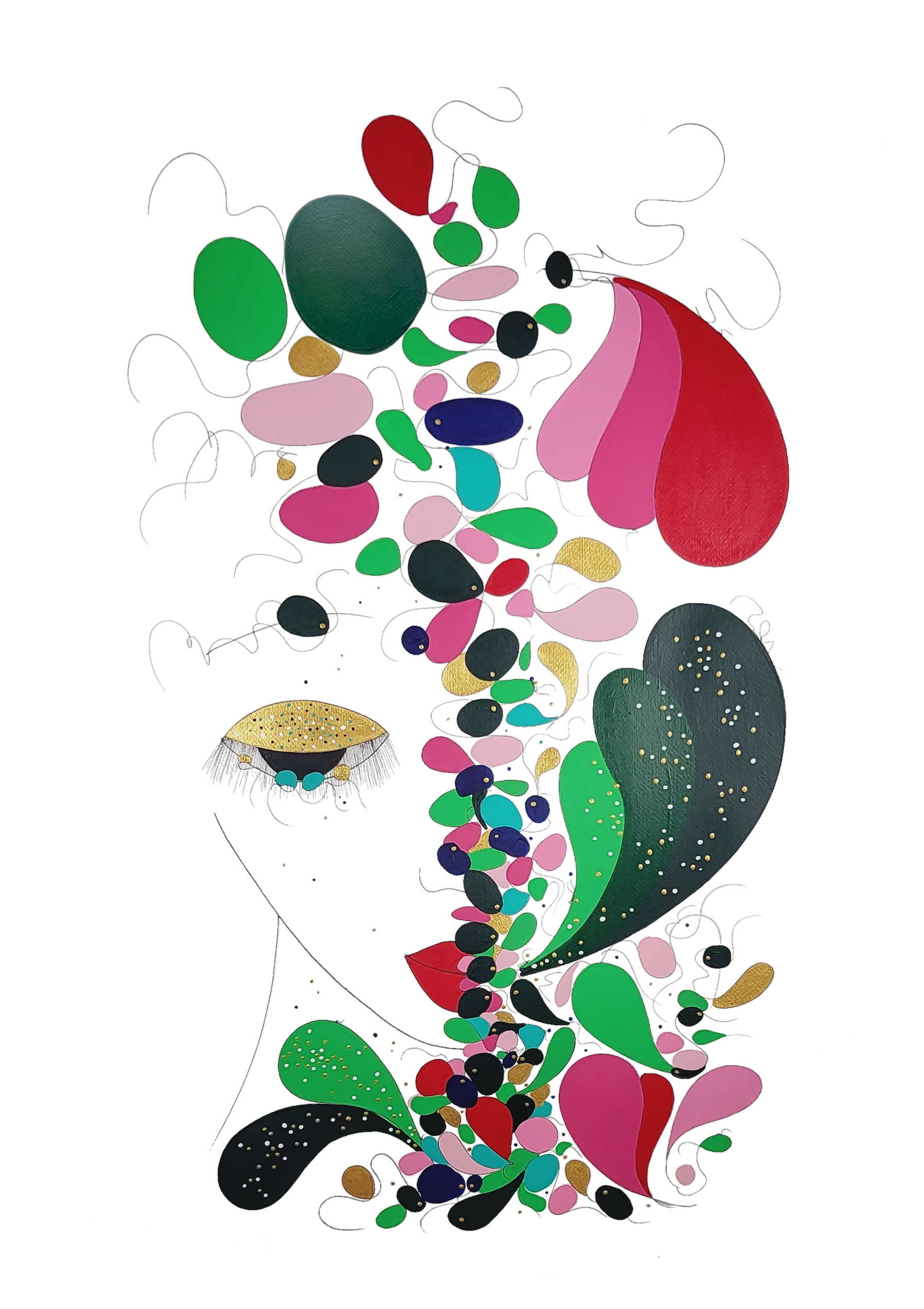 Engagée en faveur de la biodiversité et à ses enjeux, je crée cette série picturale où les couleurs vives, les roses nuancées et les verts velours, évoquent le parfum des fleurs, l’or et l’argent la lumière et les différents symboles la biodiversité.
