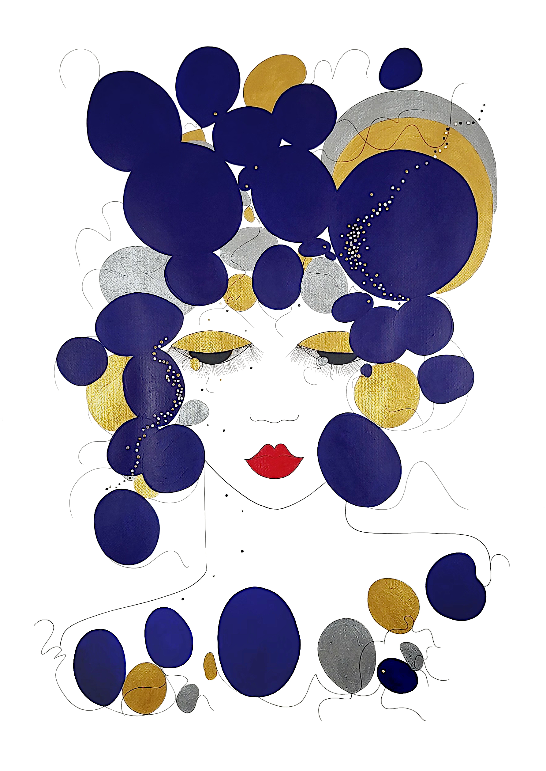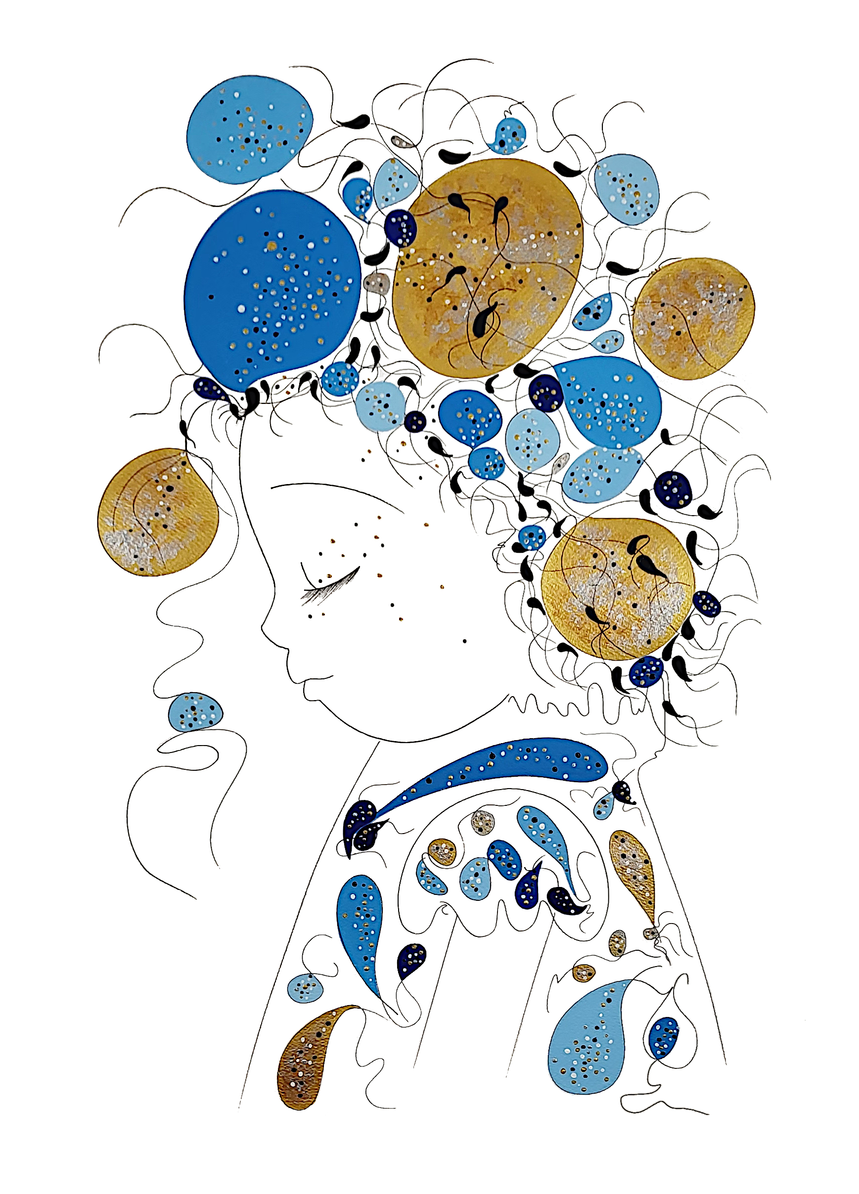 L’univers est le thème de cette série picturale où l’on y retrouve la lune, le soleil et les astres qui depuis toujours inspirent les poètes et séduisent les scientifiques. Les Dessins se fondent aux symboles, en or et en argent précieux, exaltés par le bleu velours saphir évoquant ainsi une nuit d’été étoilée.